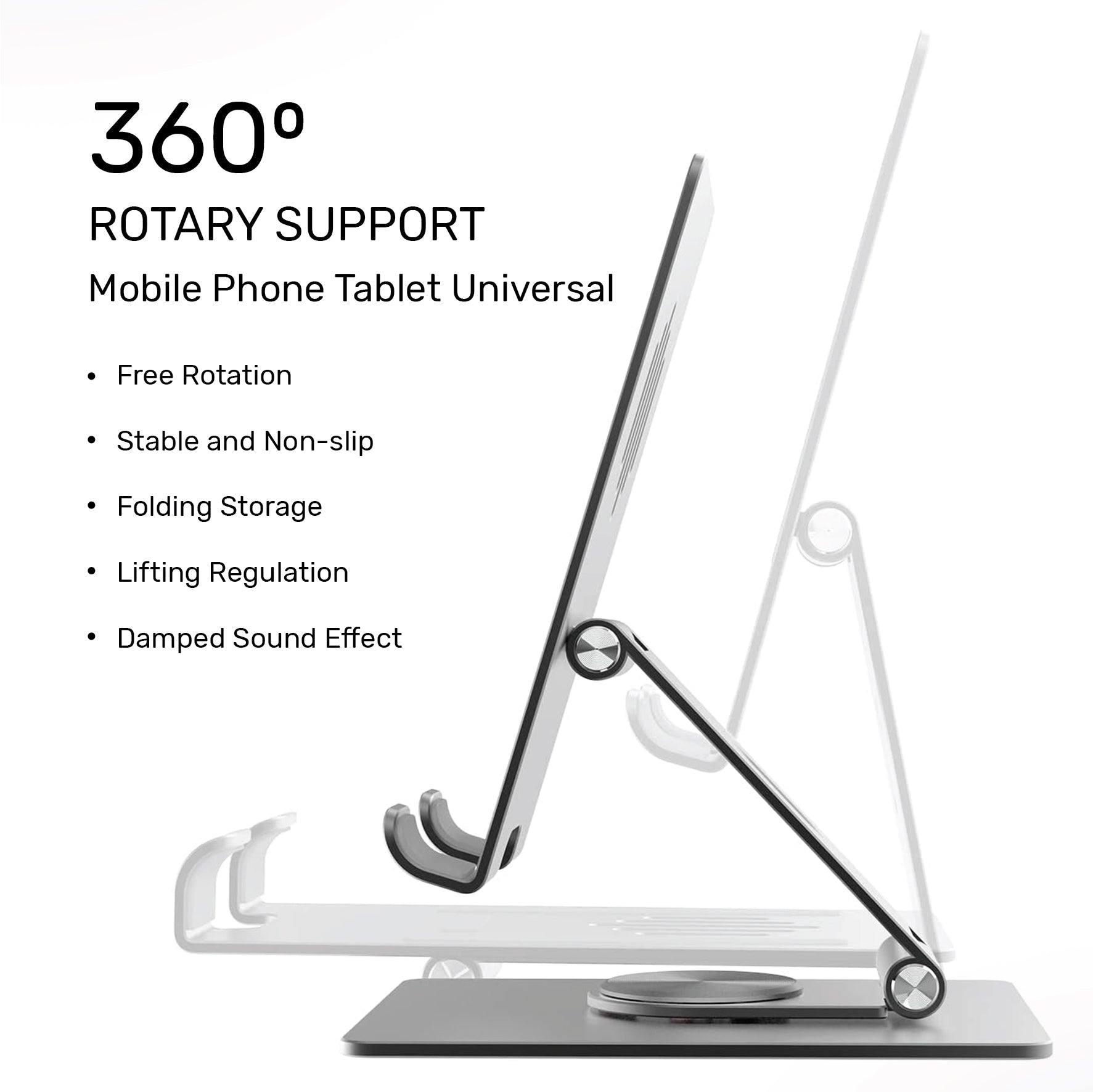 - 【قابل للدوران بحرية 360 درجة】: بالمقارنة مع حامل الجهاز اللوحي التقليدي، يمكن تدوير حامل الجهاز اللوحي الذي يدور بزاوية 360 درجة بحرية إلى أي زاوية لتحقيق زاوية المشاهدة المطلوبة وتسهيل مشاركة شاشتك. لا تحتاج إلى تحريك حامل iPad القابل للطي المصنوع من الألومنيوم ذهابًا وإيابًا عدة مرات. يمنحك حامل الجهاز اللوحي المطوَّر للمكتب هذا تجربة مثالية في العمل.