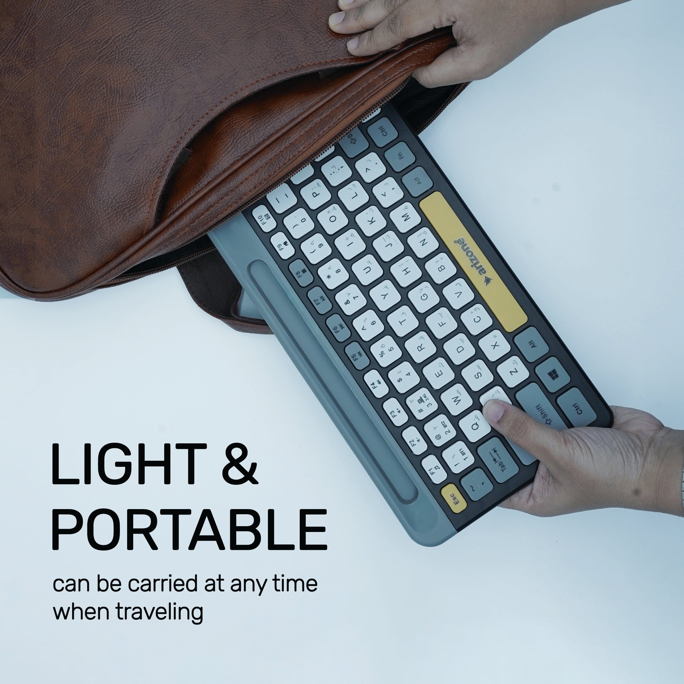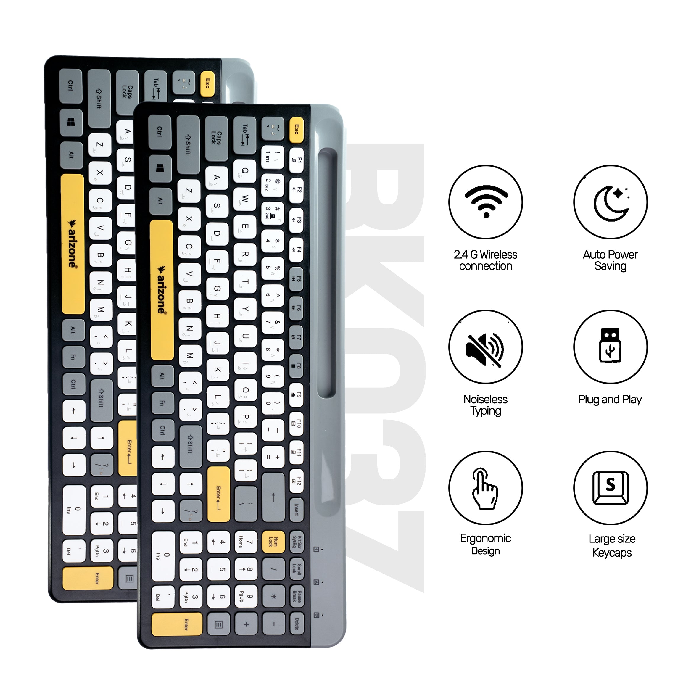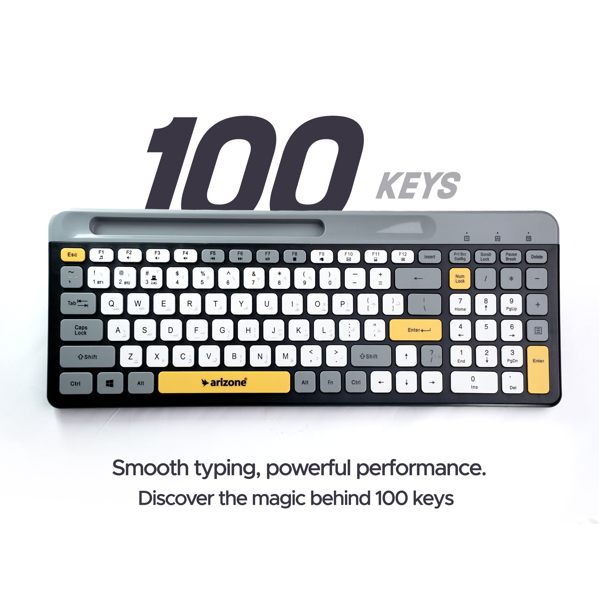 Work smarter and faster with the Arizone BK-037 Wireless Keyboard, designed for comfort and versatility. Featuring dual connectivity with both Bluetooth and 2.4GHz wireless, it seamlessly connects to laptops, PCs, tablets, and smartphones. The built-in mobile phone holder keeps your device within view while you type. With 100 responsive keys and Arabic/English key layout, this slim, stylish keyboard is perfect for both office and home use.