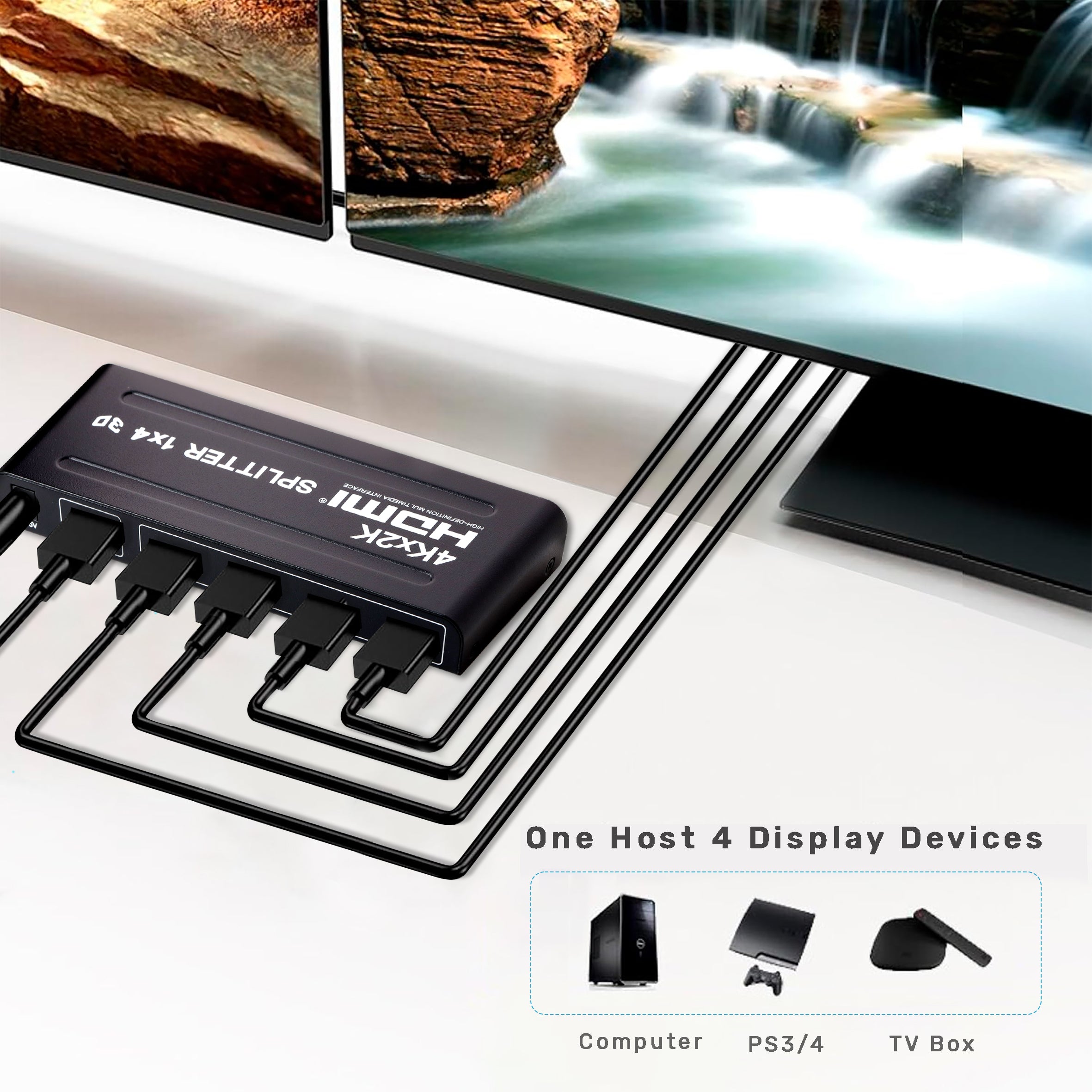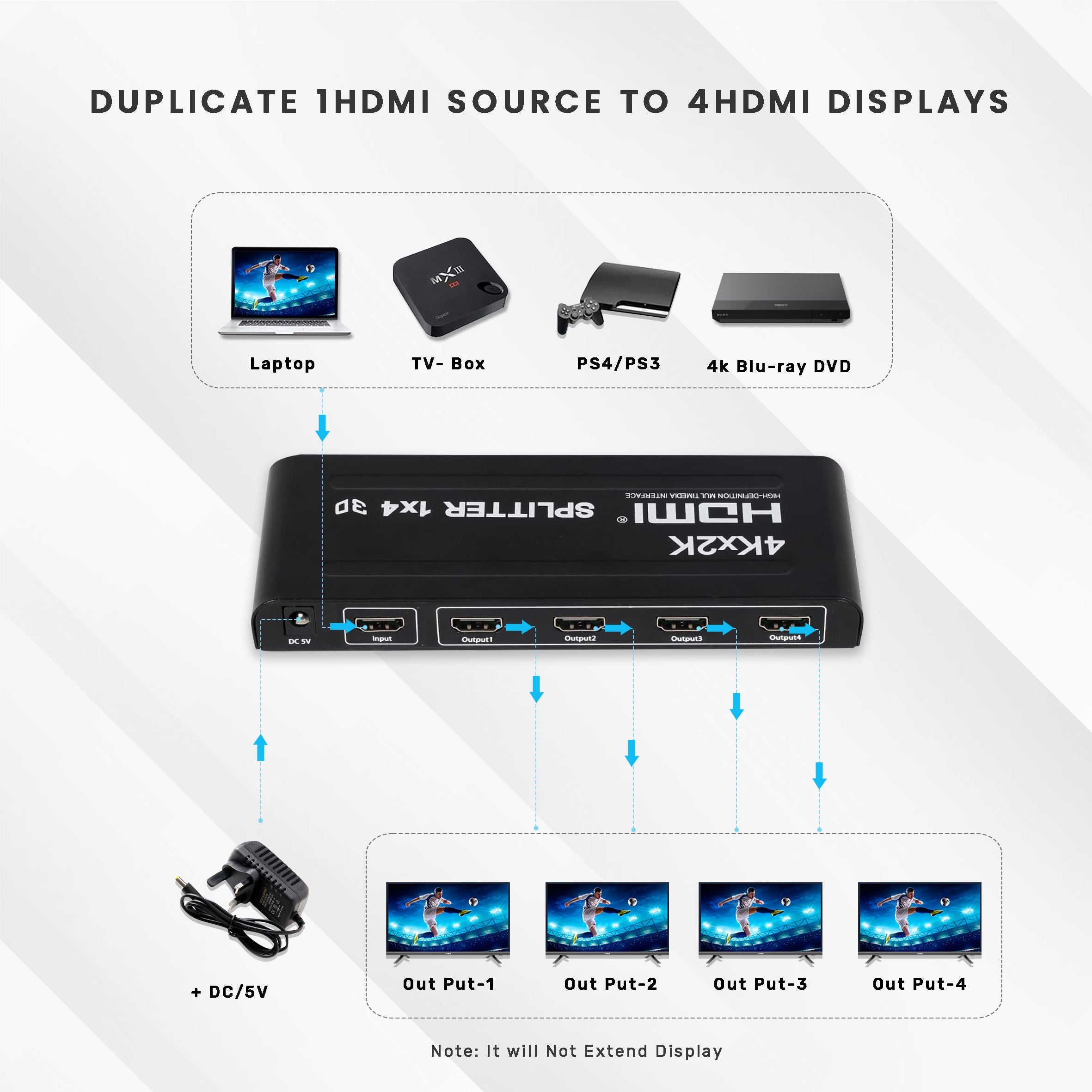 1 In 4 Out HDMI Splitter: Split One HDMI Input Signal To Up To Four HDMI output Signals Identical To The Input Signal – Input: 1X HDMI & Outputs: 4X HDMI